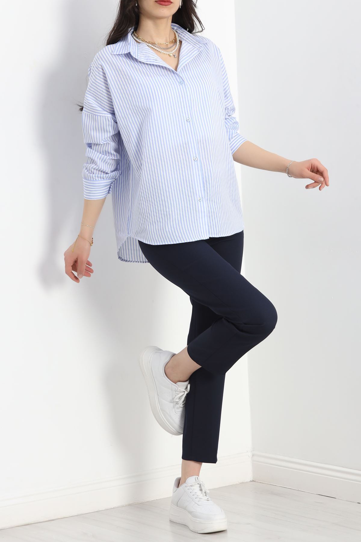 Oversize Yarasa Kol Gömlek İndigobeyaz - 30112.1874.